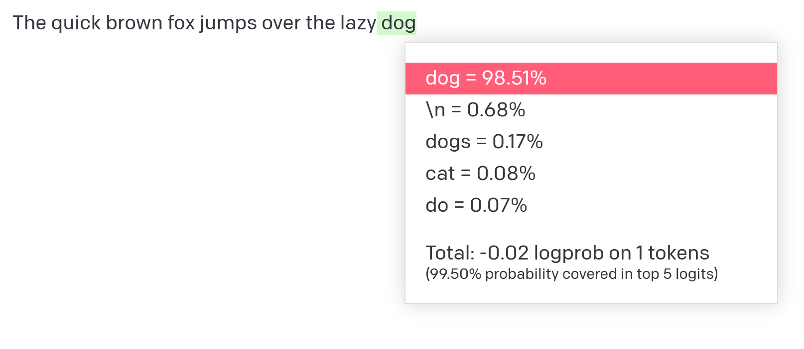 ChatGPT is a natural language processing technology developed by OpenAI. It leverages pre-trained language models such as GPT-3 to generate natural language responses to user’s questions. At its core, a GPT model simply predicts the most probable next word in a piece of text. For instance, given the sequence of words “The quick brown fox jumps over the lazy”, the model predicts the next word in the sequence to be “dog”, with 99% accuracy. Note that in the image below, the predicted words are highlighted, with their color corresponding to how confident the model is of that prediction.