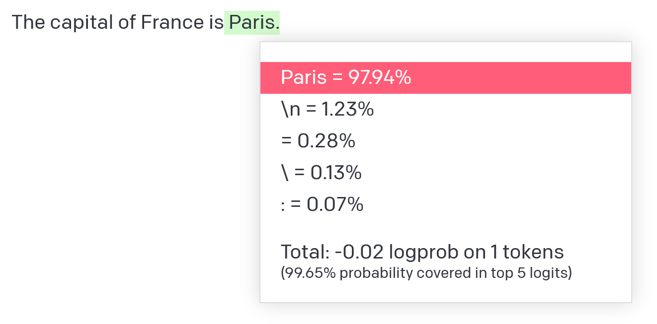 The model’s ability to do this stems from being trained on a massive dataset, containing text from many sources including the internet. As it turns out, there is enough information in this dataset that the model is able to answer simple questions quite easily, if it is convinced to do so. I use the word convinced because most of the time, you need to encourage the model to give you the output you want. For example, if I want to know what the capital of France is, one way to do this would be to provide the model with the beginning of a sentence where the answer is likely to appear. Here, the model is given “The capital of France is”, and correctly predicts the next word in the sequence to be “Paris” with a high accuracy.