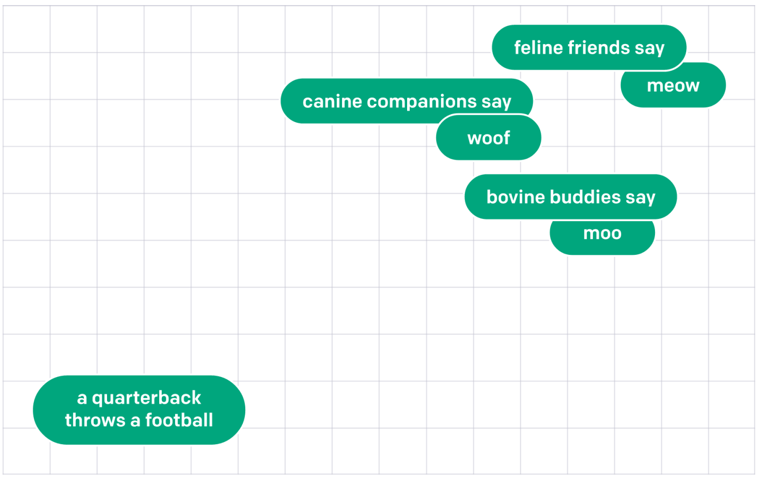 With these chunks of text extracted, I then passed each of them through one of OpenAI’s text embedding models and stored it in a database. These models produce embeddings, which are a numerical way of representing the semantic meaning of each chunk of text. As can be seen in the image below, embeddings that are numerically similar are also semantically similar. For example, the embedding of “canine companions say” will be more similar to the embedding of “woof” than that of “meow.”