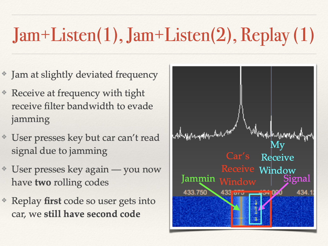 To learn about his method in more detail, I recommend you watch his DEF CON talk “Drive it like you hacked it” here. In a nutshell, his method relies on blocking the initial signal before it’s received by the car. This means that the code the attacker received hasn’t “expired” yet since the car still hasn’t moved onto the next code in the sequence. However, since the car doesn’t receive this signal, it doesn’t unlock. But what would someone do when their car key doesn’t work? Press the button again. The second time the button is pressed, the second signal is also blocked, stored, and then the first code is replayed to the car. Now, the attacker is one code ahead in the sequence, and can use the stored code later.