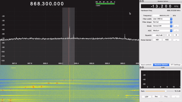Here, we see two spikes. This indicates that the type of modulation being used is FSK, at around 868MHz.