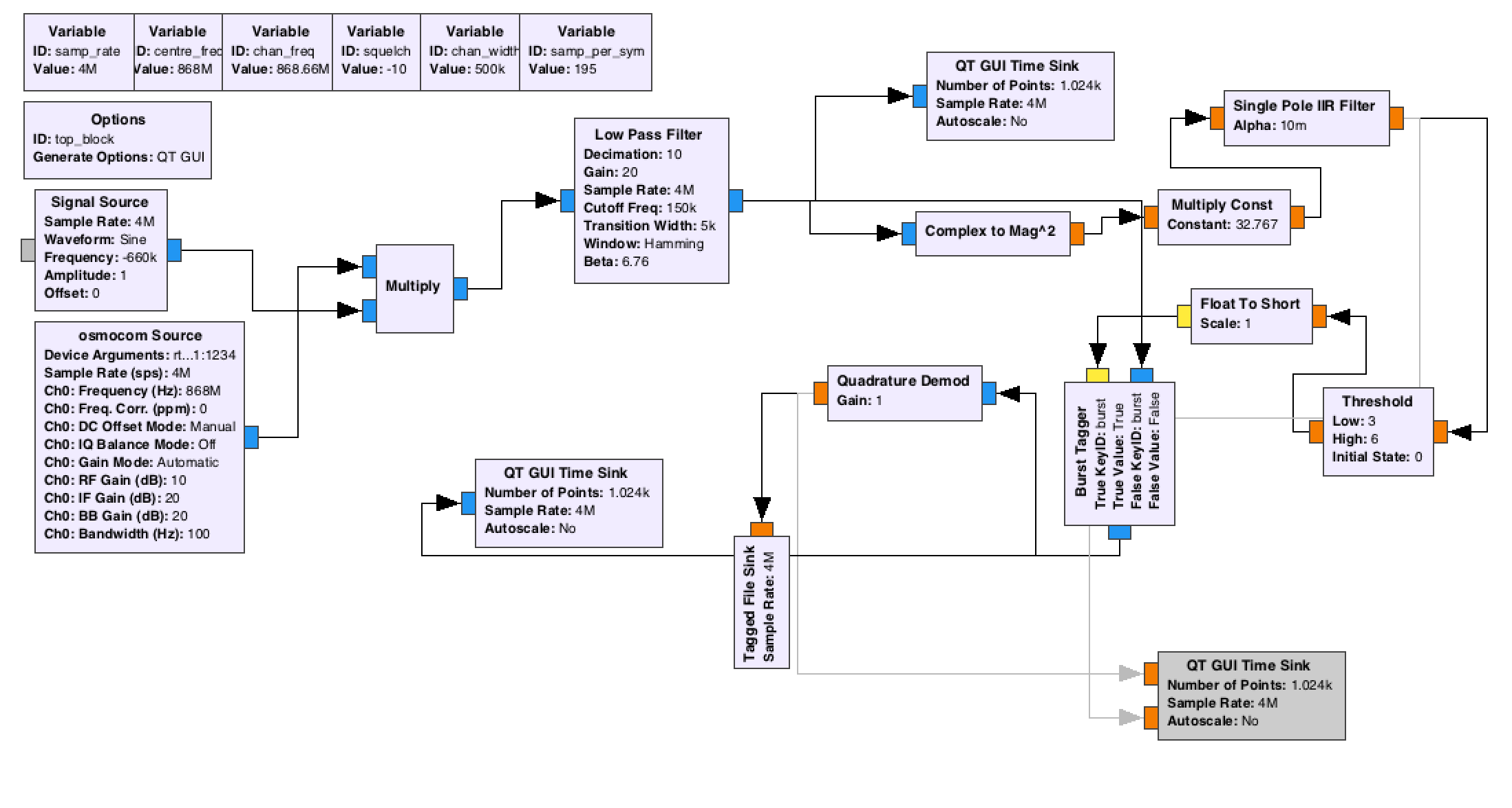 The flow graph also contains a tagged file sink, which contains raw digital data. However, to convert this to a nice stream of binary bits, we need to figure out the right baud rate. I found this talk by Michael Ossmann, where he talks about a script he wrote which automatically syncs to the right clock frequency, allowing us to decode the data very nicely.