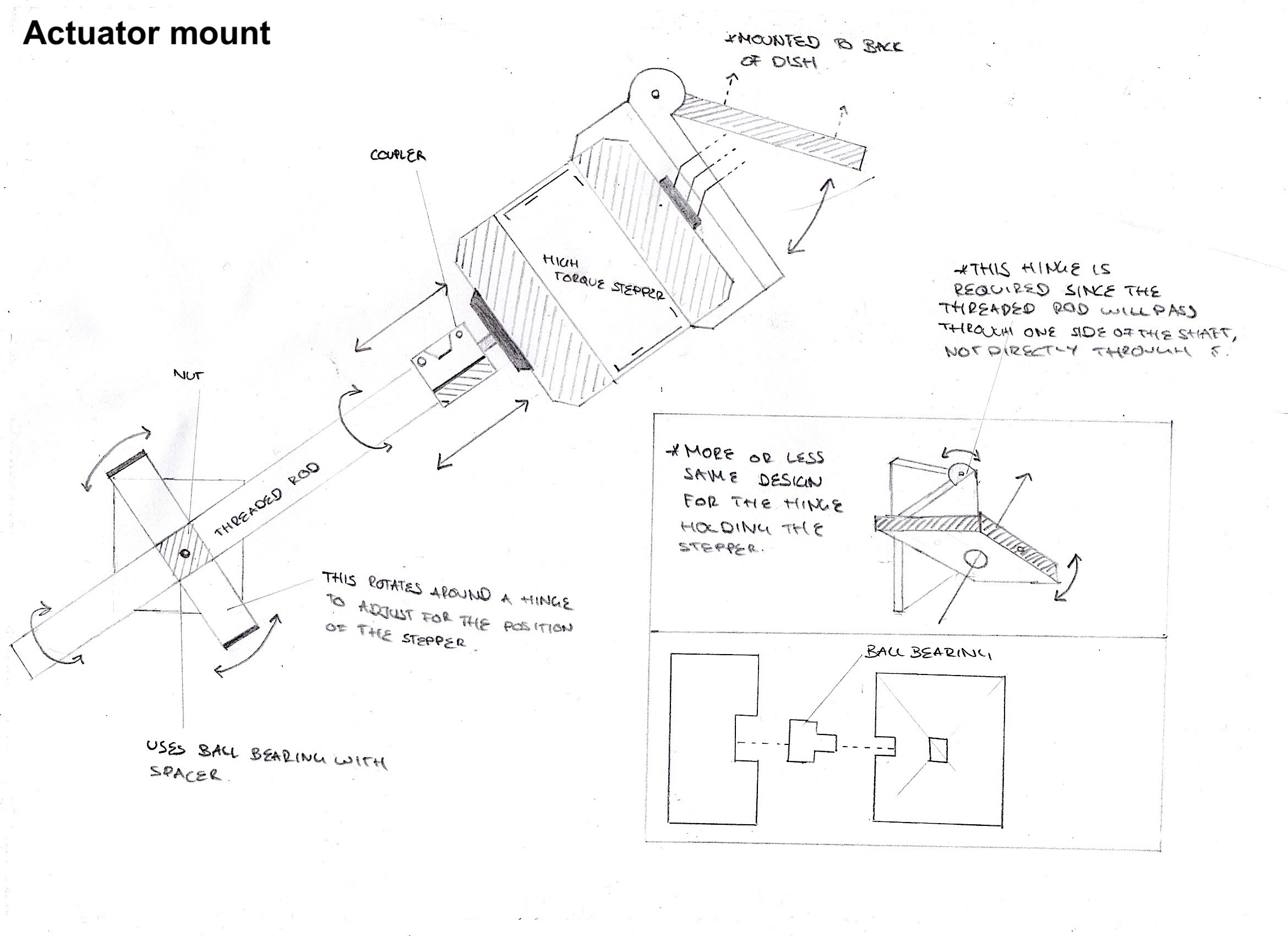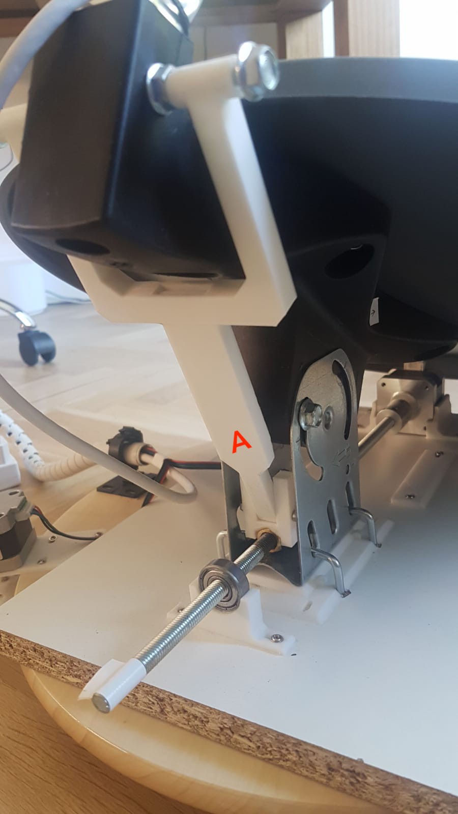 For the altitude axis, (up and down movement) I attached a stepper motor to a threaded rod using a flexible coupling. On the threaded rod I placed a nut, which, as the threaded rod rotates, moves forwards and backwards. Part A (above) is a 3D printed piece which then translates the horizontal motion of the nut into a vertical motion, to move the dish up and down, by pulling it and pushing it. I found that this method worked really well since it allowed for a decent amount of torque, and for precise, small movements. However, I was only able to point the dish between 0° and 50°(altitude), but with a few modifications i’m sure i could fix this.