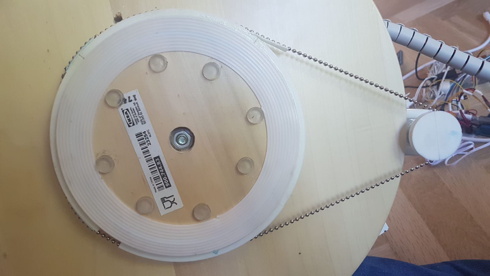 For the azimuth axis, (left and right movement) I ran a ball chain around a 3D printed adapter for the stepper motor, and around the base for the Lazy Susan. As the stepper motor rotates, the top plate of the Lazy Susan will also rotate, moving the dish, which is mounted on top of it. I had a few problems with this design, since the stepper motor had a little trouble rotating because of the weight of all the parts mounted on the turntable, but I managed to make it work in the end.