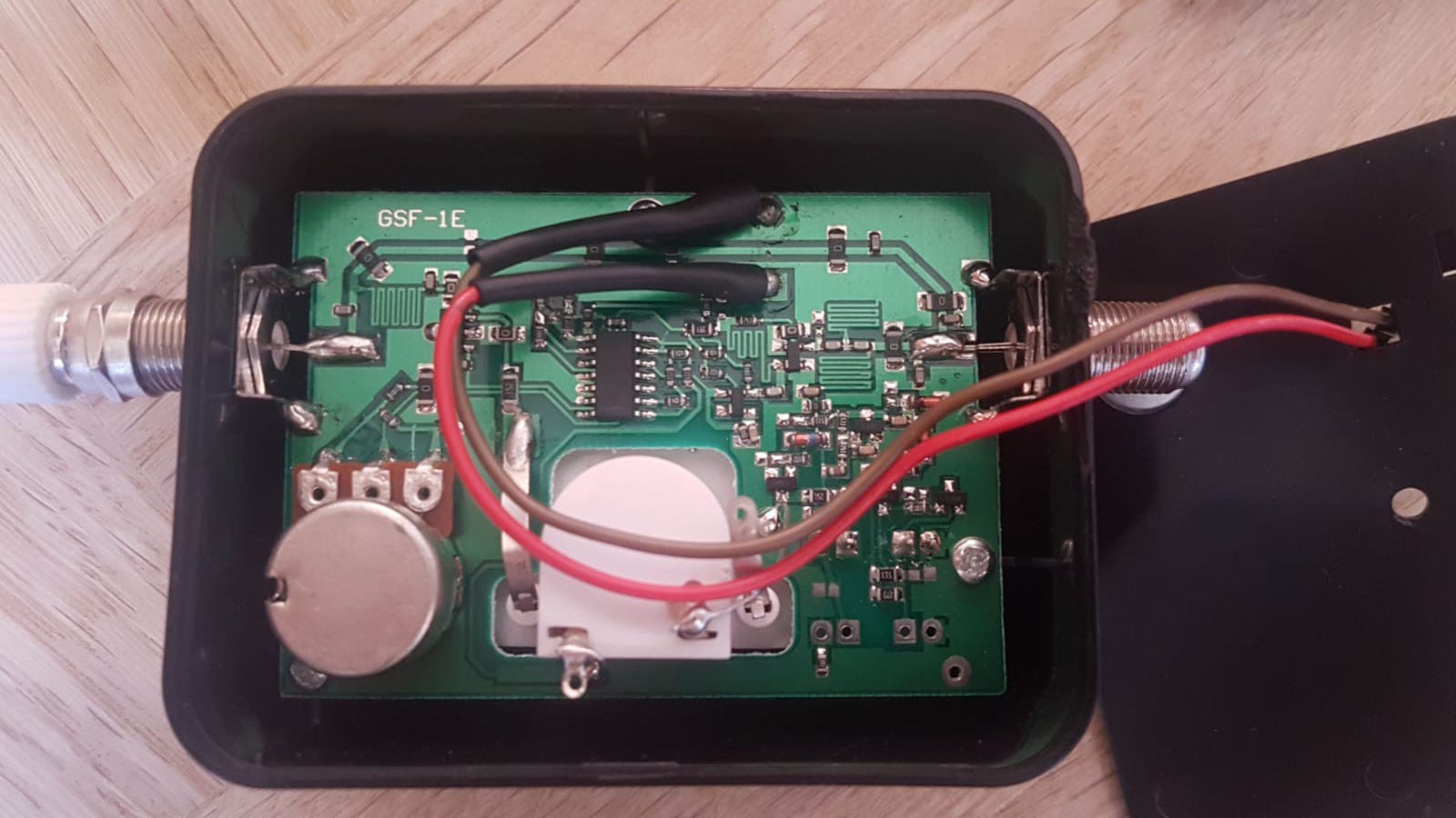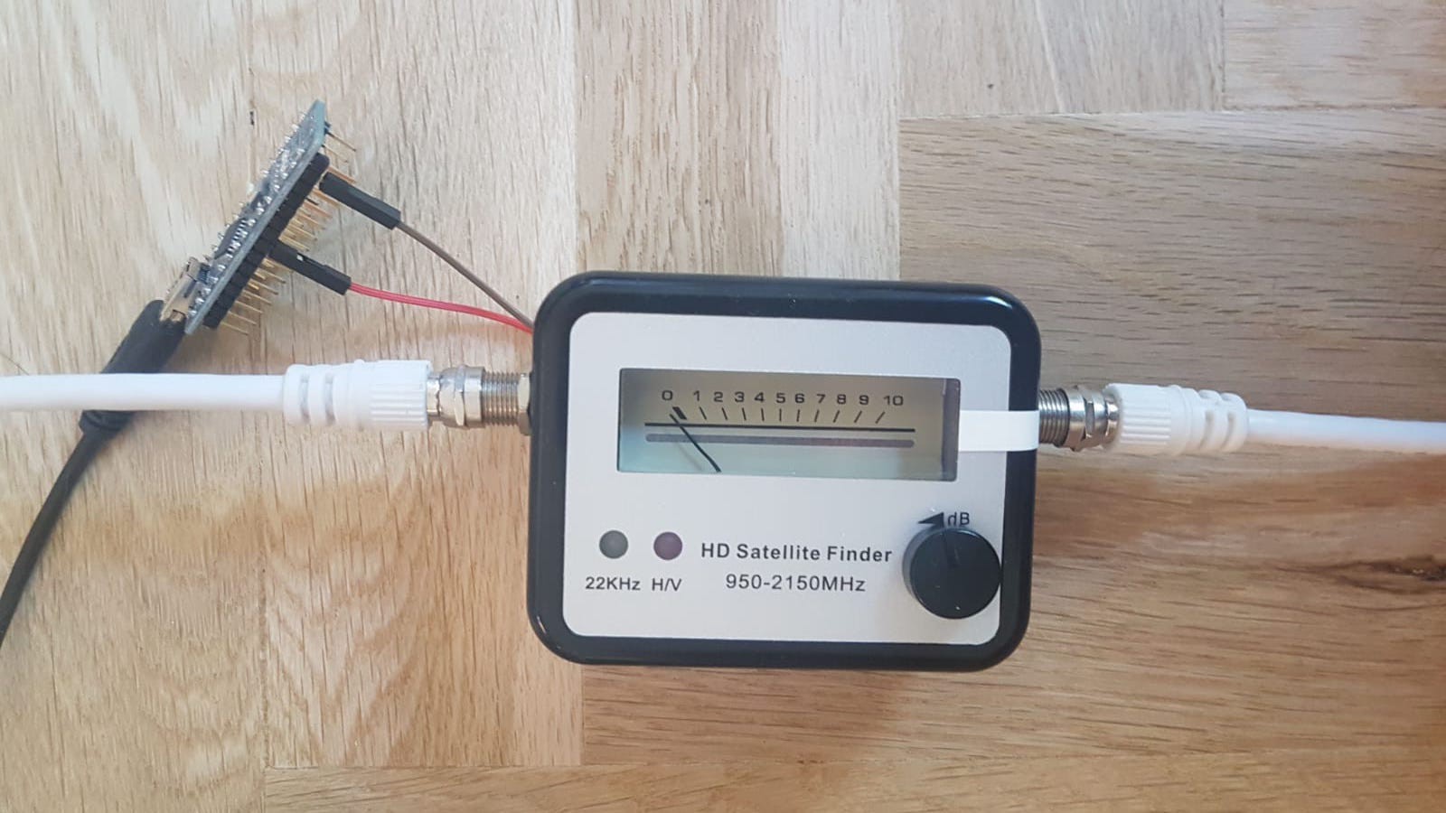 For the Raspberry Pi to be able to measure the power of the signal being received, I used a satellite finder. These are devices used to align antennas after they are installed. They are usually built with a buzzer, which changes pitch depending on the amount of signal being received. For my project, I removed the buzzer and soldered two wires onto the pads where the buzzer used to be: