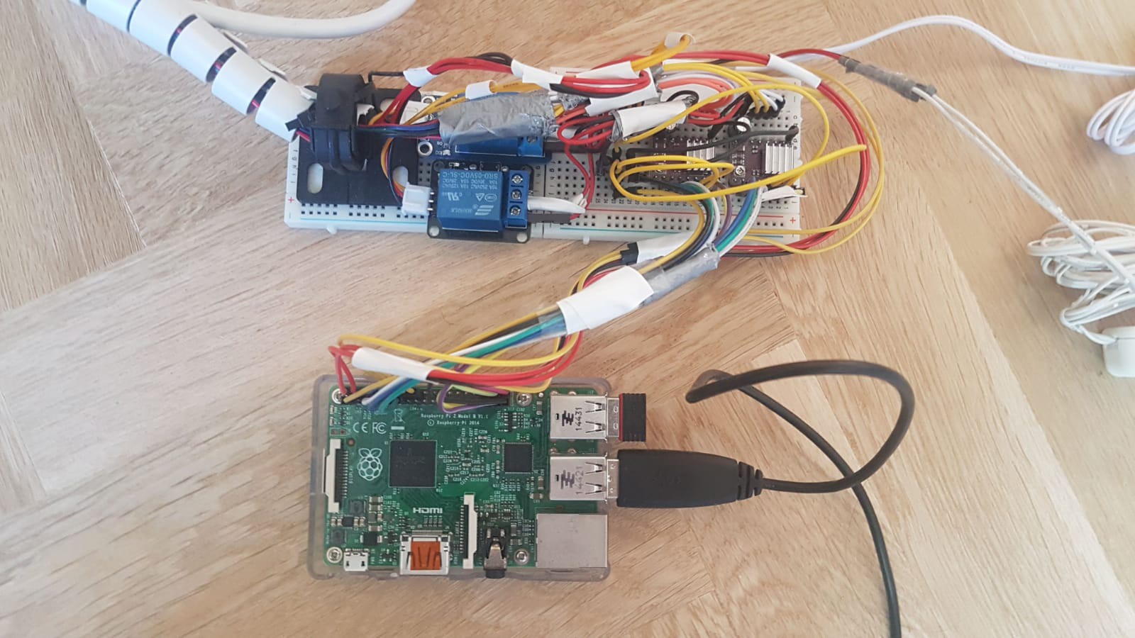 The two relays you can see in the picture below are attached to each of the power supplies for the stepper motors. This was done to prevent the stepper motors overheating by holding their position when they really didn’t have to (for example, when the dish is scanning horizontally on a certain altitude, the altitude doesn’t change so that stepper motor isn’t needed, and its power is cut off. When the horizontal scan stops and the altitude has to be changed again, the power is switched back on).