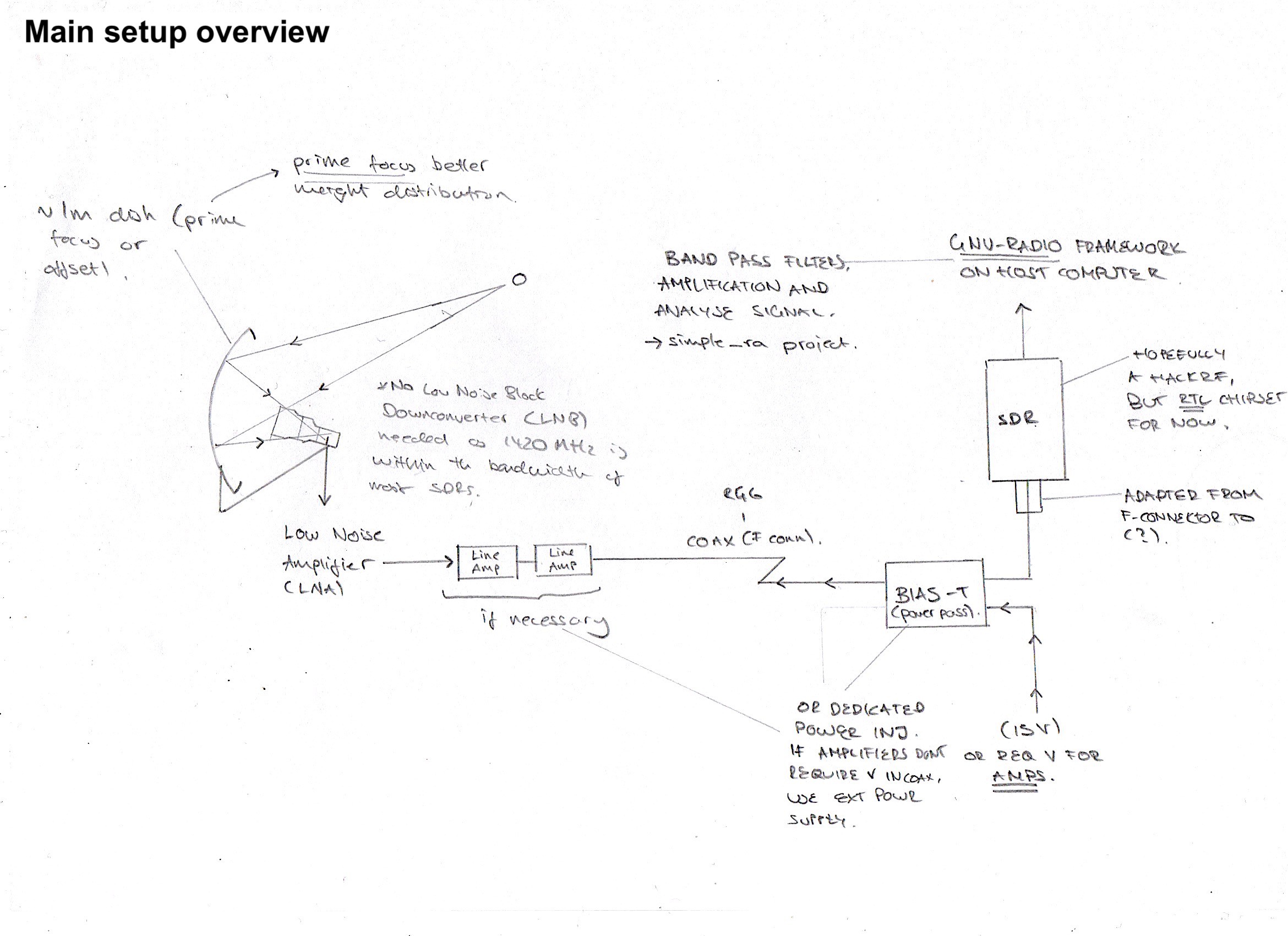This radio telescope takes pictures in radio (on frequencies between 10.7Ghz and 12.75GHz). Theoretically, this radio telescope should be able to take pictures of the sky, in radio. If the dish is aimed properly, the results should create an image of TV satellites orbiting the earth (those in geostationary orbit - they are always in the same position in the sky since they orbit the earth at the same speed at which it rotates). However, due to limitations caused by the small size of the dish, I won’t be able to do any real radio astronomy with this (with a bigger dish, we can listen to lower frequencies (due to their longer wavelength) and a larger dish would also provide increased aperture which means more gain and smaller beamwidth (so higher resolution images too) . For example, by using a 1m dish, I would be able to listen to the hydrogen line. This is a spectral line (around 1420MHz) caused by the change in energy state of hydrogen atoms. Considering hydrogen is the most abundant element in the universe, and there are huge clouds of hydrogen everywhere in our galaxy, if I applied the same imaging technique (read below), I would be able to see the centre of the Milky Way (or at least receive a faint signal at 1420MHz). Now this is pretty cool, but very difficult to achieve.
