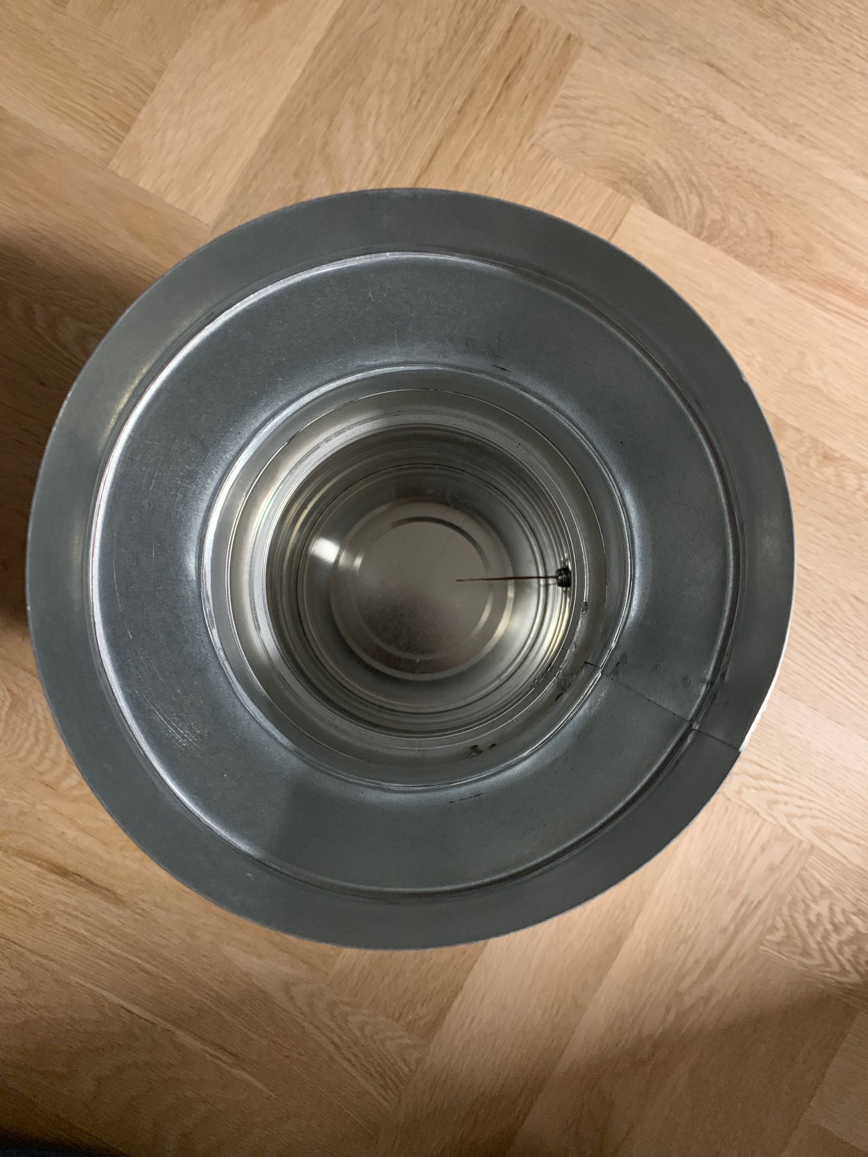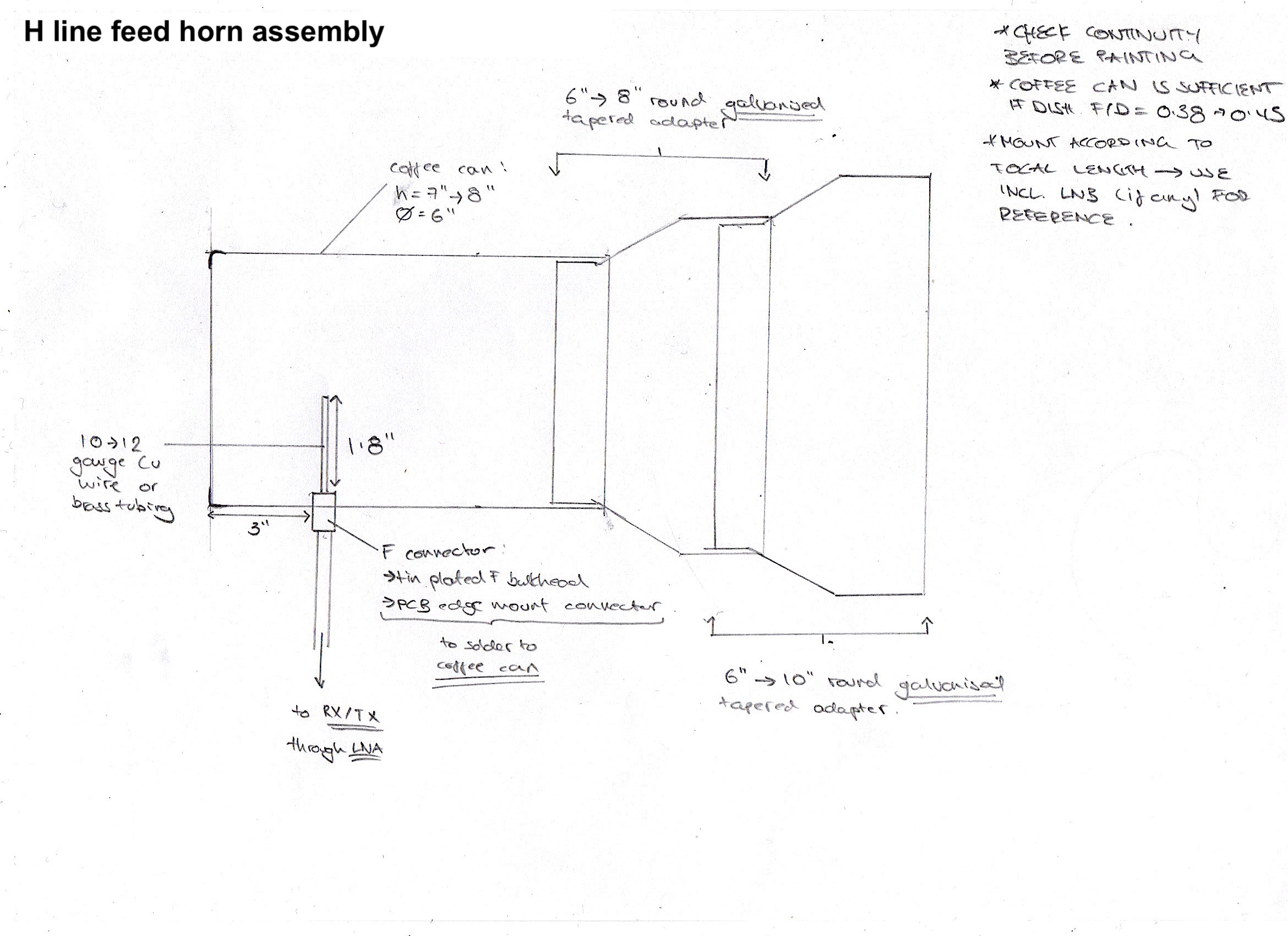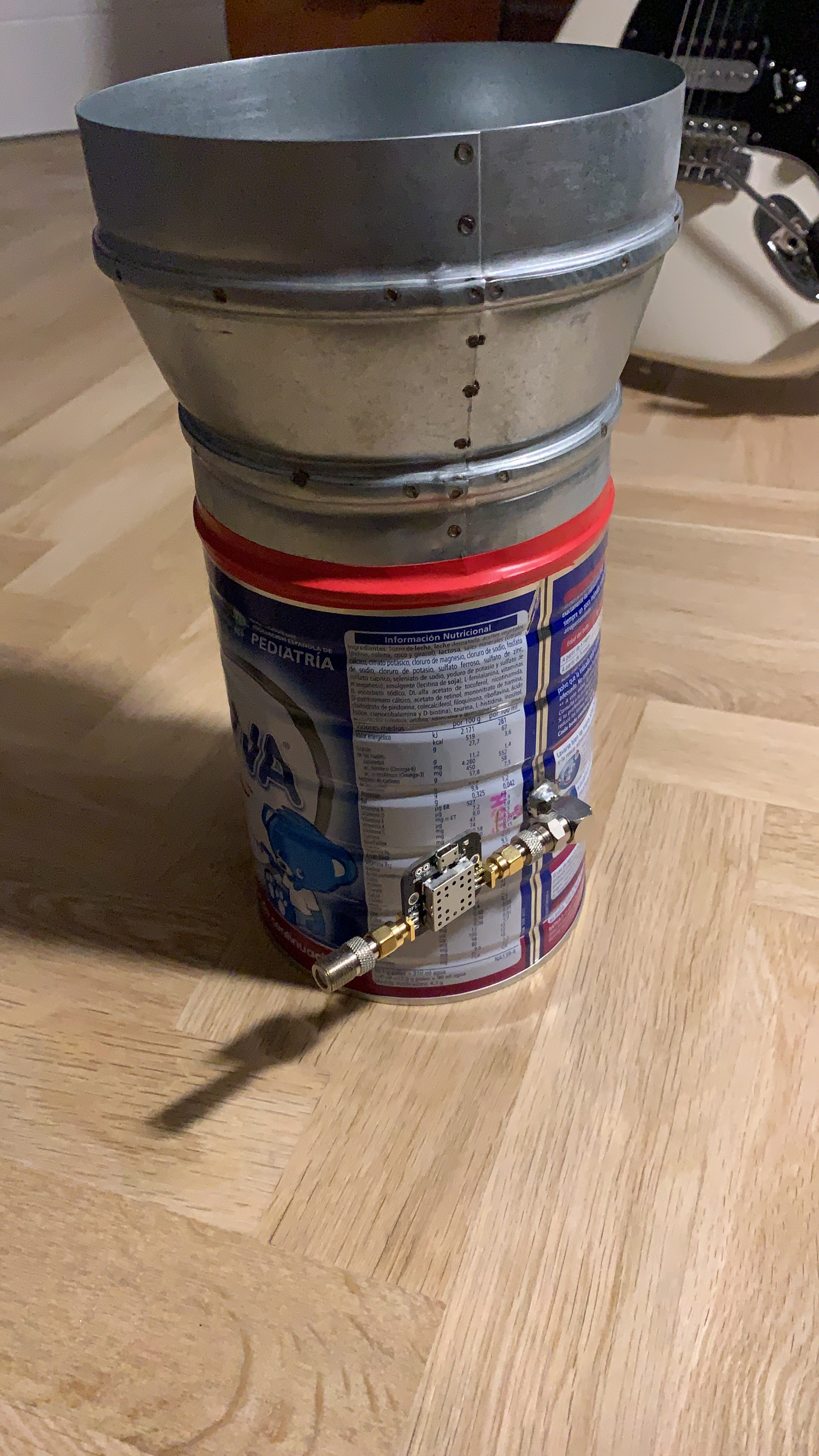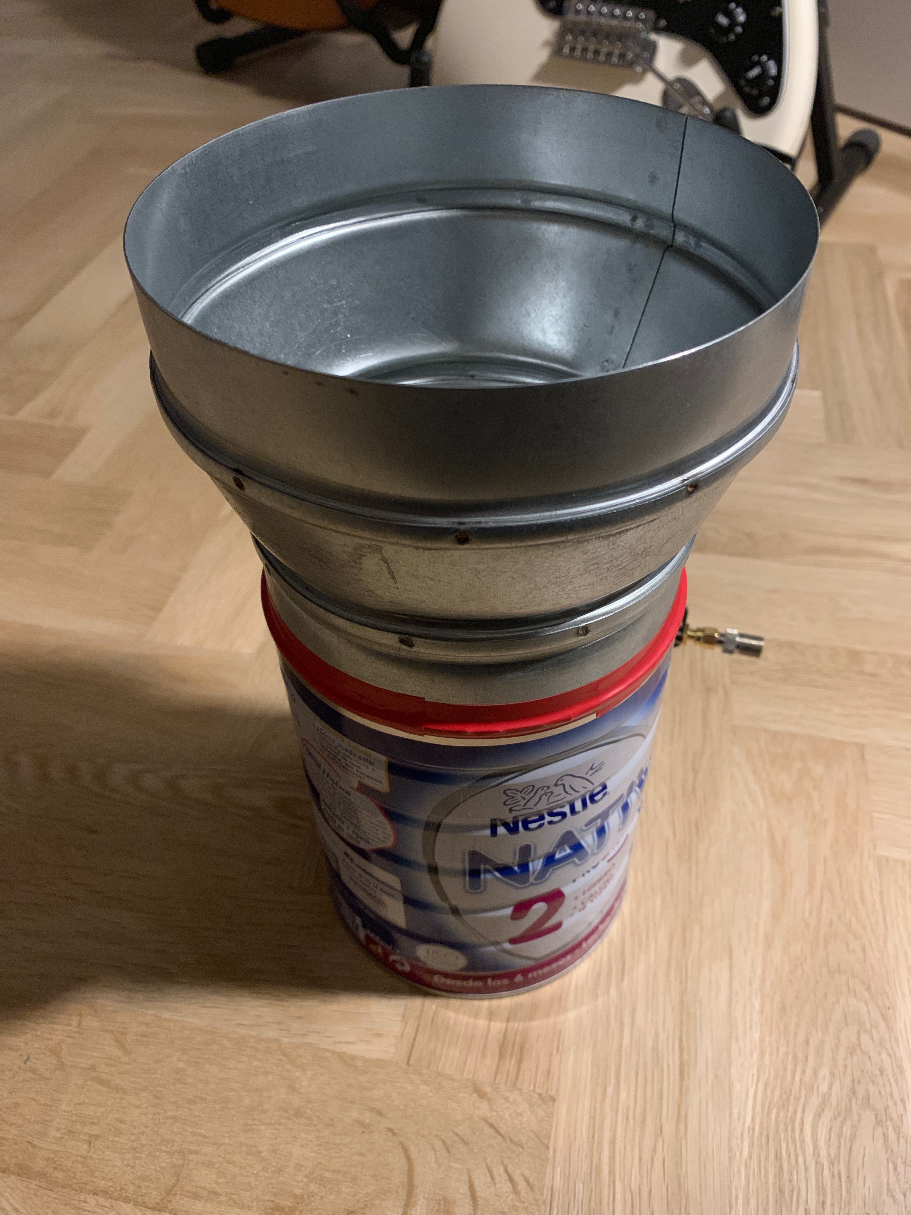 I also ordered an LNA (32 dB Gain) and attached it to a horn antenna, which would have been used as a feed for the 1.2m dish. I built the feed horn by soldering an HVAC adapter to a baby food can, and drilling a hole in the side where I inserted a 90 degree coaxial F-connector and soldered it in place.