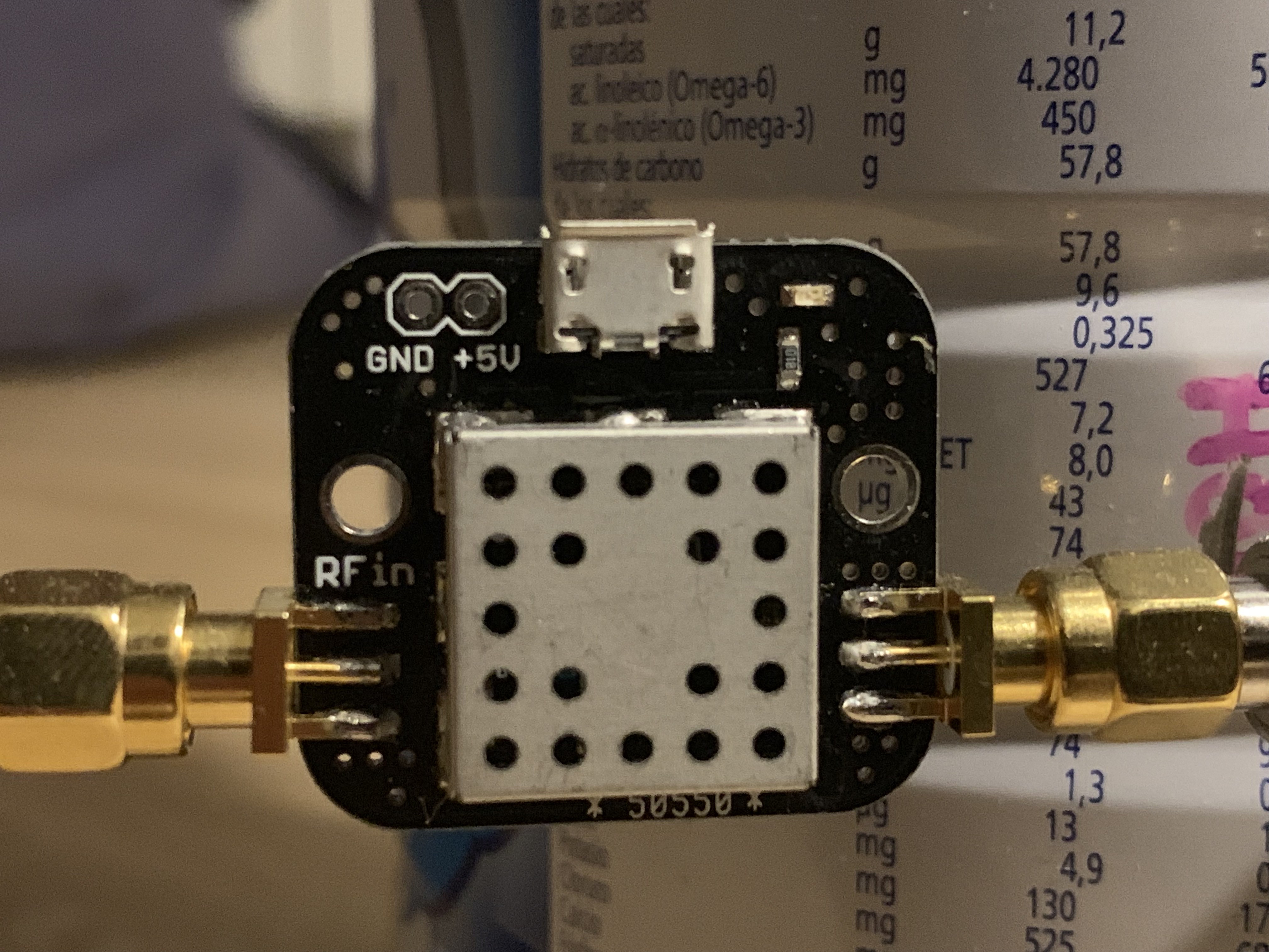 The current on these two wires (when the device is operating) is directly proportional to the amount of signal received. To measure the current I attached the wires to the analog input of an Arduino Nano (I used the Arduino because it has an analog input, which the RPi doesn’t, and I didn’t feel like using an analog to digital converter for the pi). I wrote a simple sketch on the Arduino which would read the signal, average it, and then send it to the raspberry pi over USB.